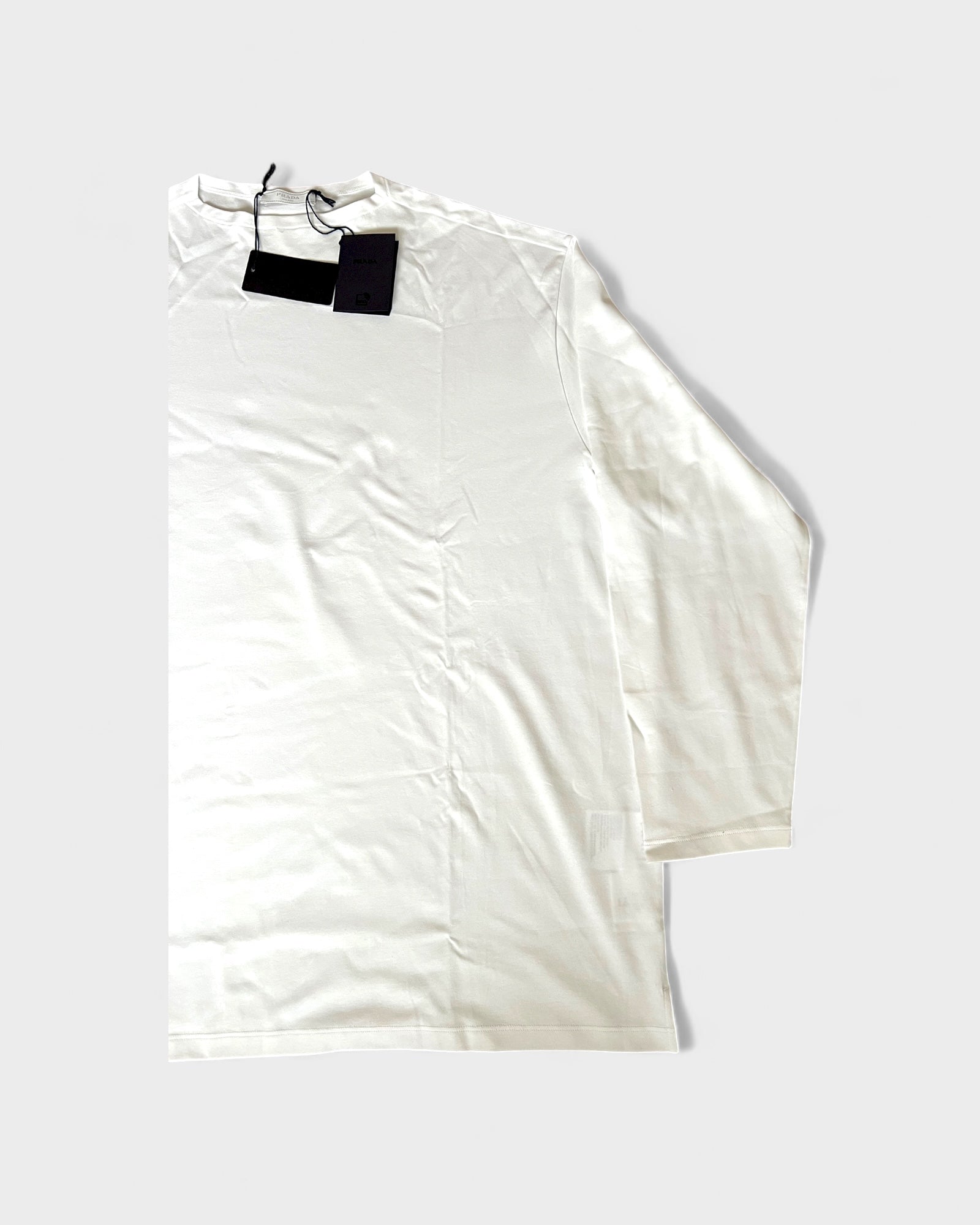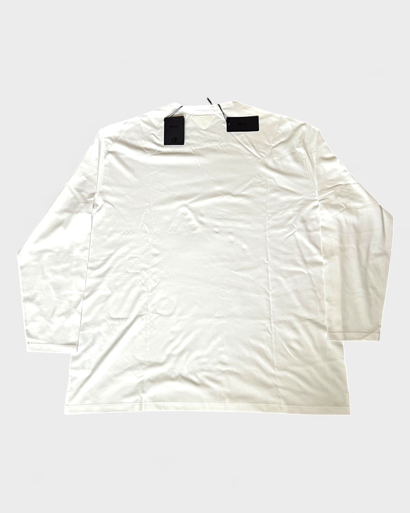 Minimalistisch, luxuriös und clean: Dieses langärmelige Shirt von Prada besticht durch seine zeitlose Eleganz und hochwertige Verarbeitung. Gefertigt aus feinster Baumwolle in reinem Weiß, ist es das perfekte Essential für anspruchsvolle Alltagslooks oder als Understatement-Piece im Layering.