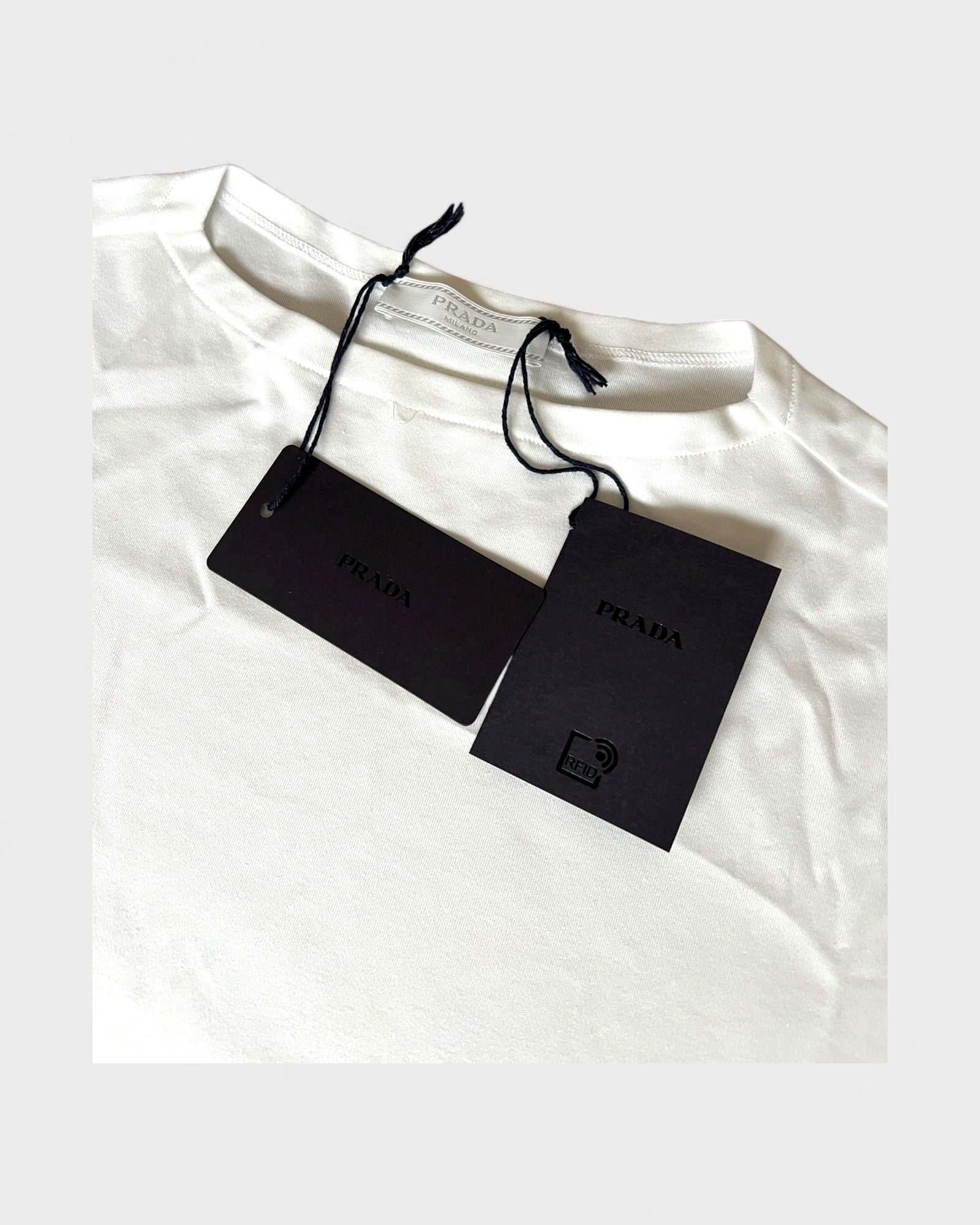 Der subtile Prada-Dreieckseinsatz im Nackenbereich sowie die tonal gehaltenen Details unterstreichen das hochwertige Design. Klassischer Schnitt mit Rundhalsausschnitt, elastischen Bündchen und dezenter Oversize-Anmutung.