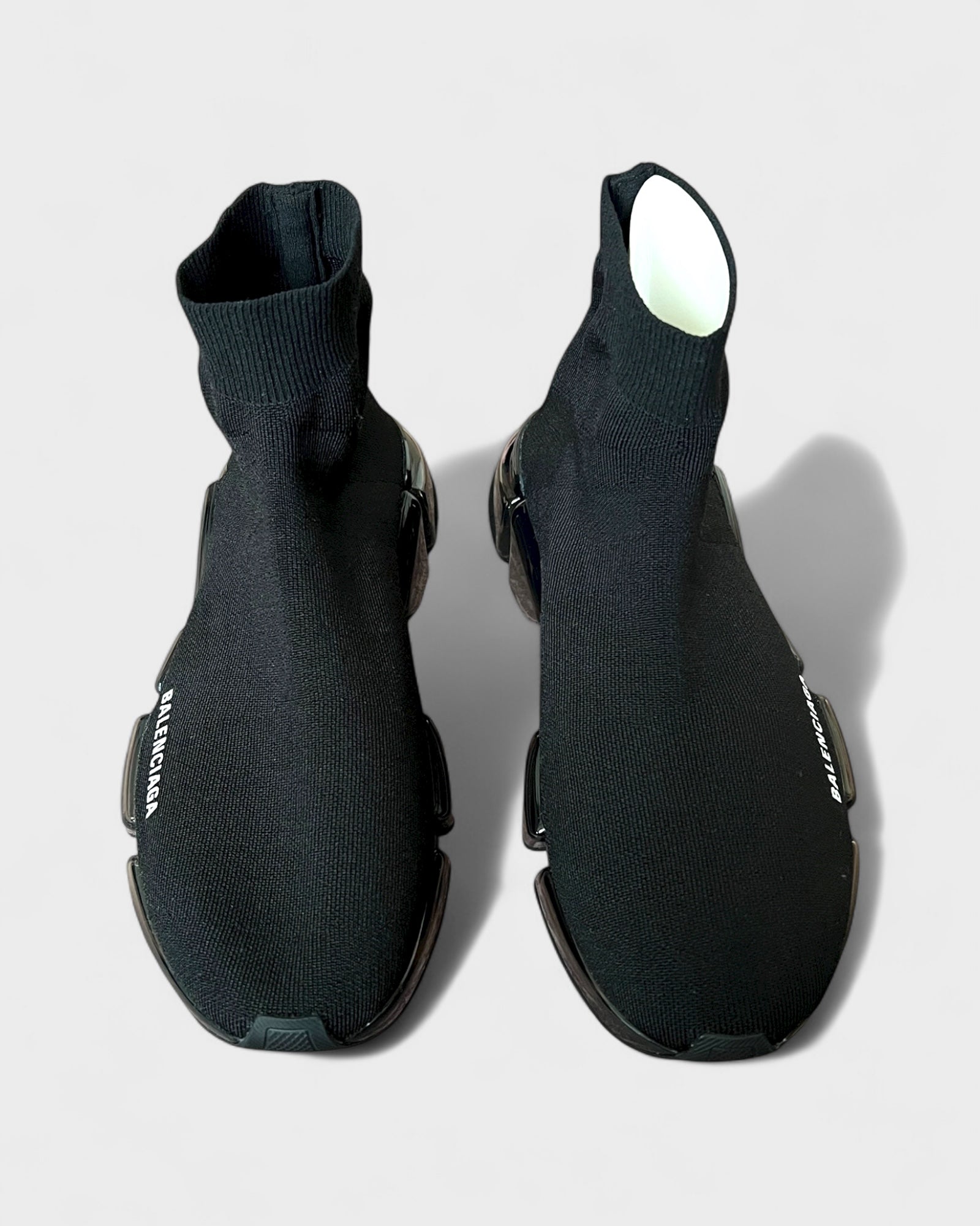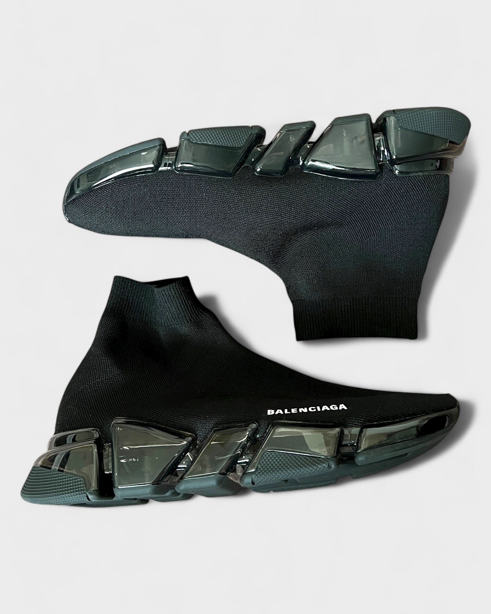 Der „Speed 2.0“ von Balenciaga ist die überarbeitete Version des ikonischen Sock-Sneakers – mit neuer, dynamisch segmentierter Sohle für noch mehr Flexibilität und futuristischen Look. Das nahtlose Strick-Obermaterial passt sich wie eine zweite Haut an und sorgt für ultraleichten Tragekomfort, während die auffällige Profilsohle das Design modern und sportlich abrundet.