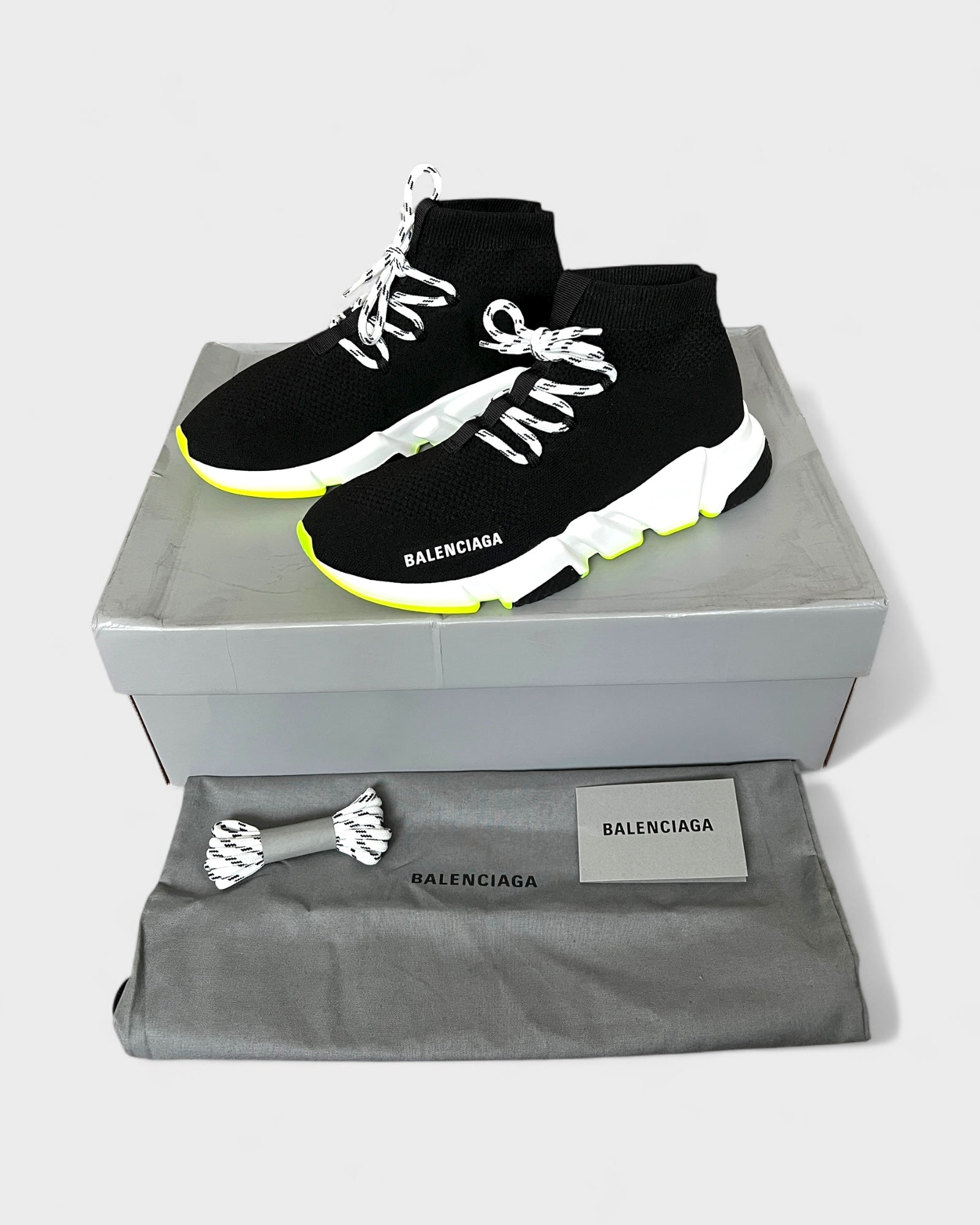 Der Speed von Balenciaga trifft in dieser Variante auf sportliche Schnürung und auffällige Neonakzente. Das gestrickte Obermaterial passt sich wie eine zweite Haut an den Fuß an, während die dynamische Sohle mit klaren Linien und leuchtendem Gelbgrün für ein futuristisches Statement sorgt. Inklusive Ersatzschnürsenkel, Staubbeutel und Originalverpackung.
